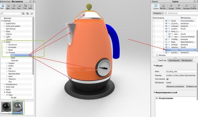 Шаг 3Для металлических частей возьмем материал Metal-> Chrome-> Basic-> Chrome Polished.
