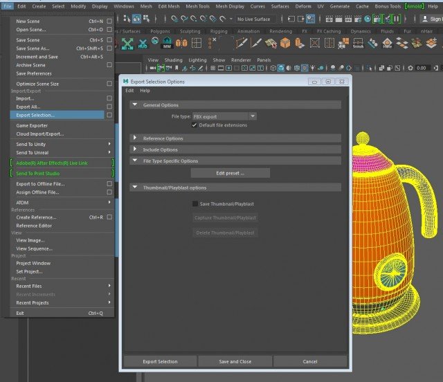 Шаг 1Для экспорта модели чайника выполняем следующие несложные действия: