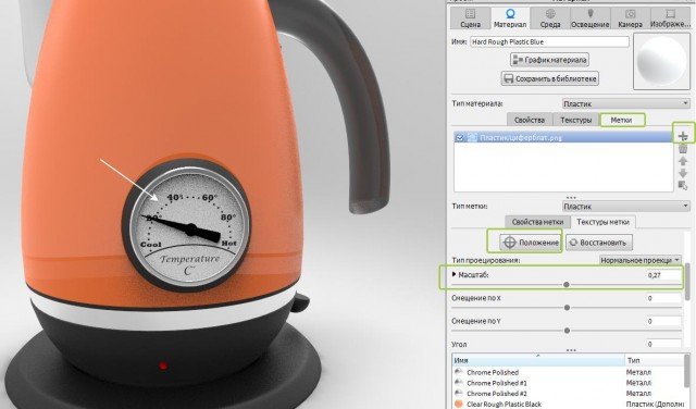 В закладке Материалы выберите еще одну закладку Метки (Label) и справа нажмите на значке плюс -> Добавить метку. Далее, выберите файл, который вы создали в графическом редакторе или используйте мой.
