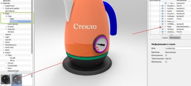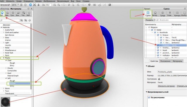 Назначить материал можно простым перетаскиванием из окошка на деталь. Примените материал резины (Rubber) к подставке и к нижней части корпуса чайника.