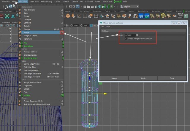 Шаг 8Чтобы все это исправить, нужно всего лишь соединить все точки по центру детали. Для чего мы воспользуемся инструментом Merge из меню Edit Mesh. Выберете более удобный вид чтобы выделить нужные вершины (например, Front). Выделите все вершины по центру и нажмите на кубик опции Merge. Откроется окно настроек, где вам нужно всего лишь выставить минимальное расстояние равное 0.0100 и нажать Apple.