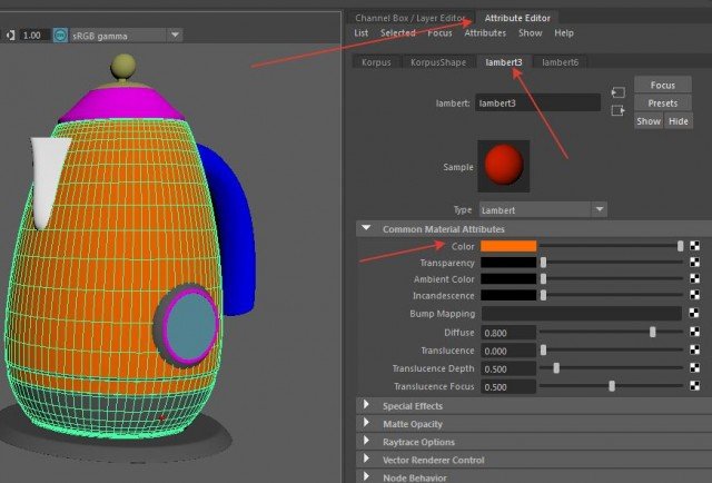 Шаг 2В окне Attribute Editor щелкните на окошке с цветом (Color). И в раскрывшемся окне Color History выберите любой цвет. Повторите эти операции для других деталей.