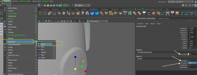 Шаг 4Выделите нашу деталь. Выберите инструмент Deform> Nonlinear> Bend.