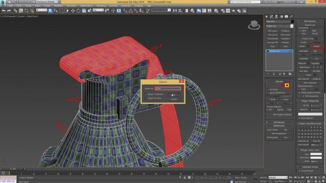 Шаг-15.После этого, конвертируем выделенные рёбра в выделенные полигоны, с помощью удерживания клавиши Shift. После этого, отсоединяем выделенные полигоны в отдельный элемент, нажав на кнопку Detach.