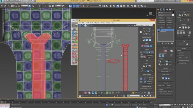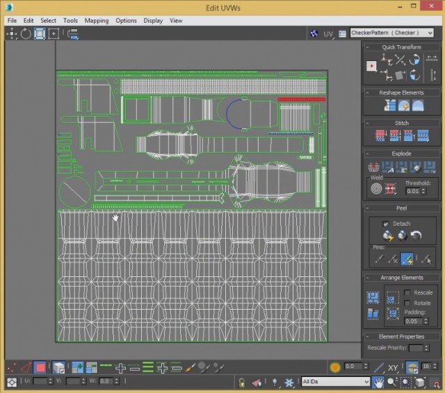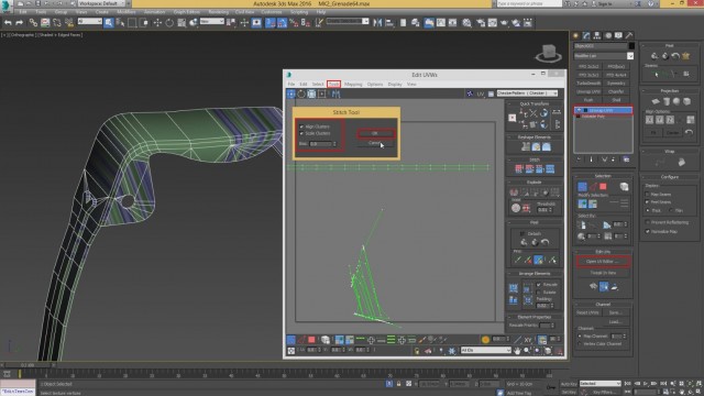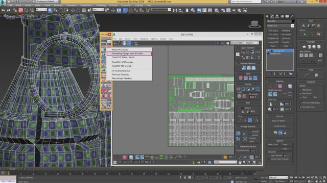 После того, как TexTools установлен, открываем его и кликаем на указанную кнопку, чтобы получился узор. На эту кнопку, можно кликнуть 2 раза, чтобы узор стал зелённым, как показано ниже. Далее, кликам на указанное меню, в окошке UV. После всех нажатий делаем Collapse модификатора Unwrap UVW. После этого, узор должен остаться на объекте.