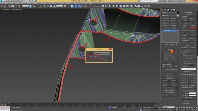 Шаг-38.На этом развёртка полностью готова и осталось её подготовить к переносу в программу Substance Painter. И первое, что нужно сделать - это дать каждому элементу гранаты своё имя. Для этого, переходим в модификатор Editable Poly и на уровне Element выделяем каждый из элементов, нажимаем на кнопку Detach и называем его. Всего в сцене присутствует 5 элементов. Я назову их: a_low, b_low, c_low, d_low и e_low соответственно. Вы же можете назвать своими именами - это не принципиально. На скрине ниже я показал, эти элементы.