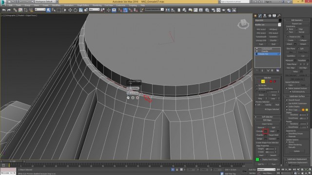 Шаг-6.Продолжаем работу над этой деталью. Выбираем указанное ребро и делаем Extrude во внутрь, чтобы выглядело всё, как будто детали вкручено друг в друга. После этого, не снимая выделения с выбранного ребра, зажимаем клавишу Shift и кликаем на Polygon, тем самым выделив вдавленные полигоны и нажимаем Auto Smooth. Также, можно немного уменьшить значение модификаторы Chamfer, чтобы всё смотрелось более реалистично.