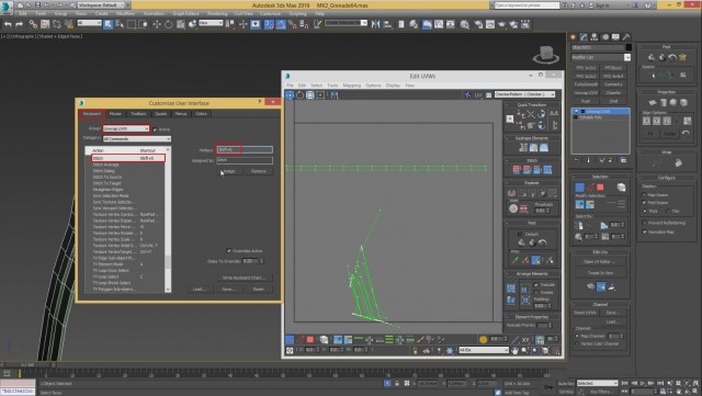 Шаг-16.Теперь применяем модификатор Unwrap UVW и зададим горячую клавишу для команды Stitch, которой мы будем в дальнейшем многократно использовать. Команды Stitch нужна для того, чтобы при выборе одного ребра на развёртке, выделялось синим цветом все другие связанные с ним рёбра на 3D модели.