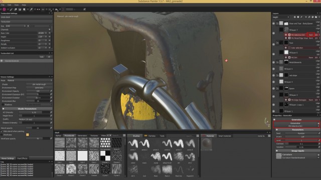 Шаг-27.Создадим в этом же каталоге ещё один заполняющий слой Fill layer 9. Этот слой будет добавлять царапины на объект. Добавим этому слою чёрный материал и отключим информацию о высоте и металле. После этого добавим чёрную маску и следом на чёрную маску добавим генератор MG Mask Builder. Изменим параметры Intensive и Level генератора показанные ниже. В итоге должен получиться некий масленый вид.