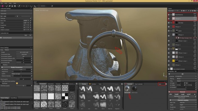 Шаг-12.На данный момент все базовые материалы назначены и пришло время добавить больше потёртостей всем объектам гранаты. Начнём с основы и скобы.
