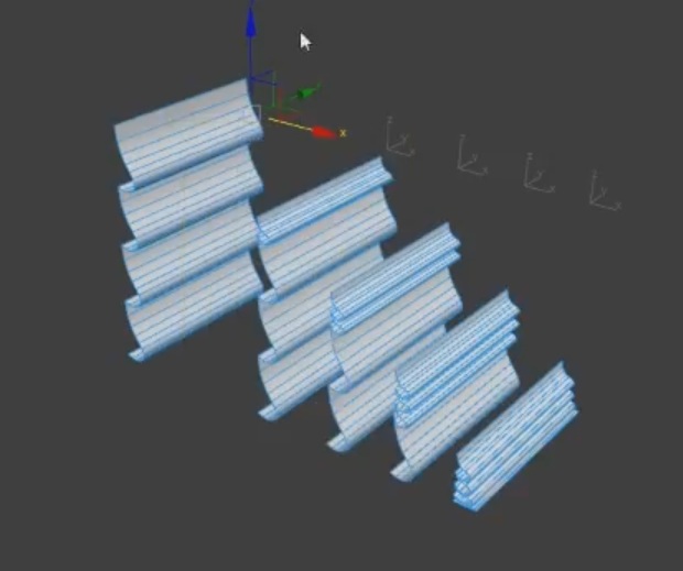 Шаг-5.Теперь нам необходимо сделать 4 копии нашего объекта, но делать это необходимо постепенно, деформируя каждую из них. Т.е. по мере складывания шторки, нам необходимо это изобразить.