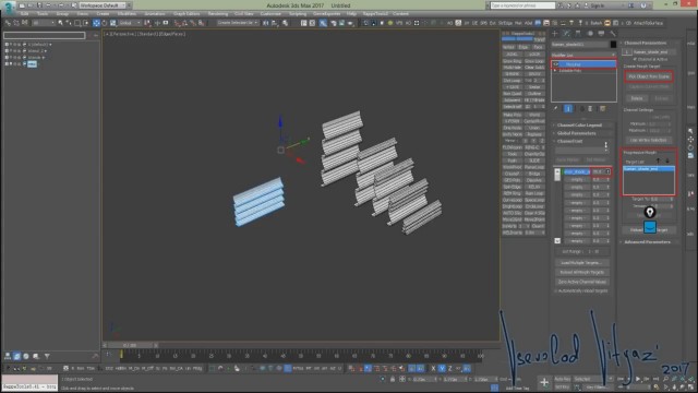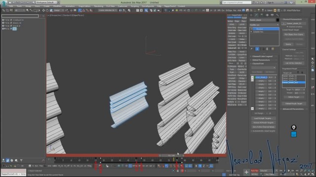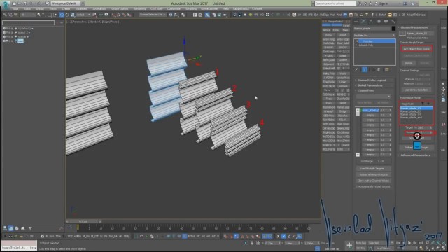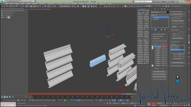 Для примера как работает модификатор Morpher, скопируем самую первую шторку и применим к ней модификатор Morpher. После этого, укажем конечный результат, во что должна превратиться штора, т.е. нажимаем на кнопку Pick Object from Scene, затем кликаем по самой маленькой шторке. После этого, они появятся в списке Target it. И чтобы посмотреть, как будет анимироваться данная шторка при таких настройках, покрутим указанный первый параметр в настройках модификатора Morpher.