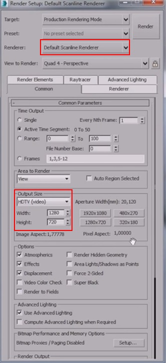 Шаг-10.Заходим в меню Rendering -> Render Setup, либо нажимаем горячую клавишу F10. В появившимся окне, в строке Renderer, вбираем Default Scanline Renderer. Тут стоит отметить, что для более больших сцен, используют другой Renderer, однако для нашего простого объекта подойдёт и такой.