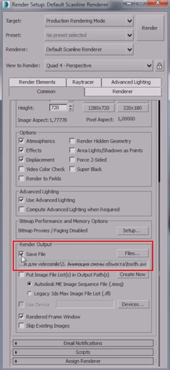 Теперь прокручиваем ниже и находим свиток Render Output и ставим там галку напротив Save File и указать папку для сохранений файла. На самом деле эта галочка очень важна, т.к. если её не поставить, то при рендере будет просчитано также все 50 кадров, однако сохранить можно будет только последний 50-тый кадр.