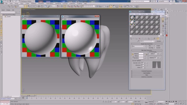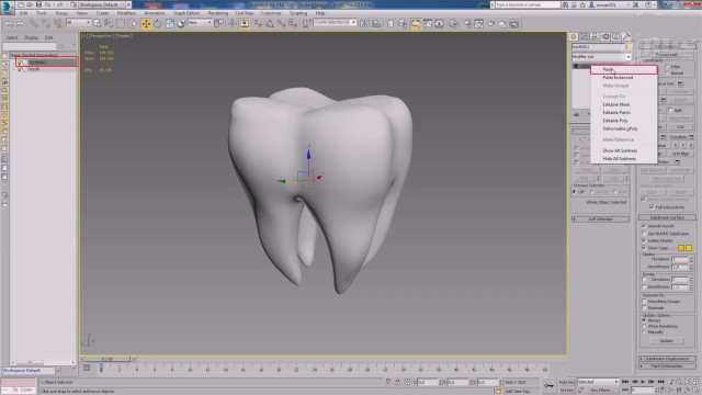 Шаг-3.Теперь сделаем копию нашего объекта. Для этого выделим объект, нажмём CTRL+V и сделаем копию, поставив галочку напротив Copy. Теперь, когда у нас есть 2 объекта зуба, применим к первому зубу материал серого цвета, а к объекту второго зубу применим белый материал.