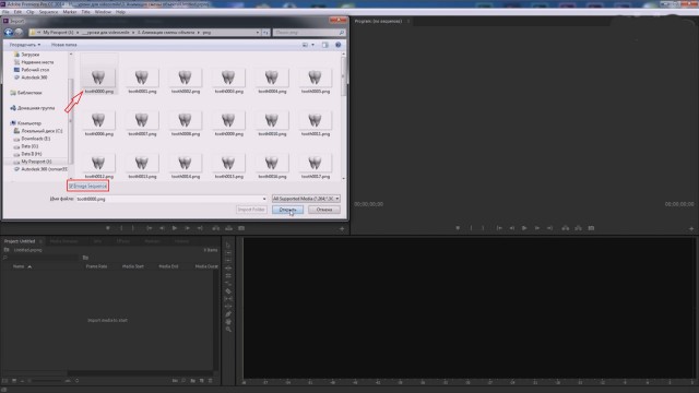 Шаг-12.Теперь, когда открылся интерфейс программы, нажимаем сочетание клавиш CTRL + I, для импорта картинок. После этого, находим папку с нашими изображениями, выделяем первую картинку и ставим галочку Image Sequence, т.е. последовательность картинок. Далее, нажимаем кнопку Открыть и видим, что наши картинки импортируются в окно программы, как единый видео файл.