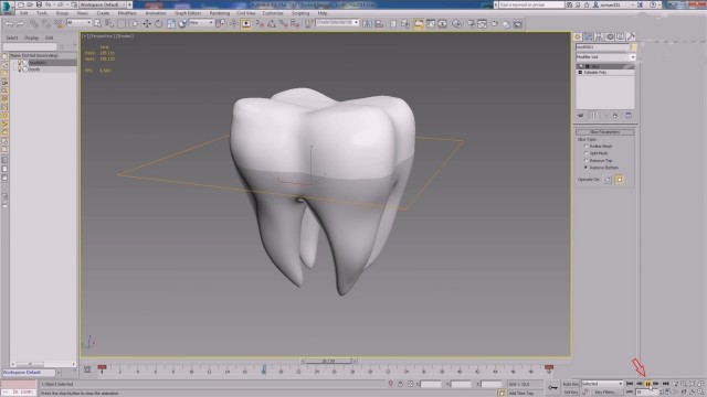 Шаг-9.Поскольку анимация была применена для серого зуба, то при копировании модификатора Slice Plane на второй объект, анимация также скопировалась.