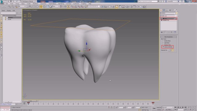 Шаг-7.Теперь нам необходимо проделать то же самое для объекта с белым зубом tooth001, только чтобы объект не исчезал, а наоборот появлялся. Тут есть довольно важный момент, если мы назначим объекту tooth001 модификатор Slice Plane, после чего его настроим, как мы делали с предыдущим объектом, то ничего хорошего из этого не получится, т.к. вручную не получится данный модификатор настроить также, как и в объекте tooth. По любому будут расхождения и так называемый дыры при анимации.