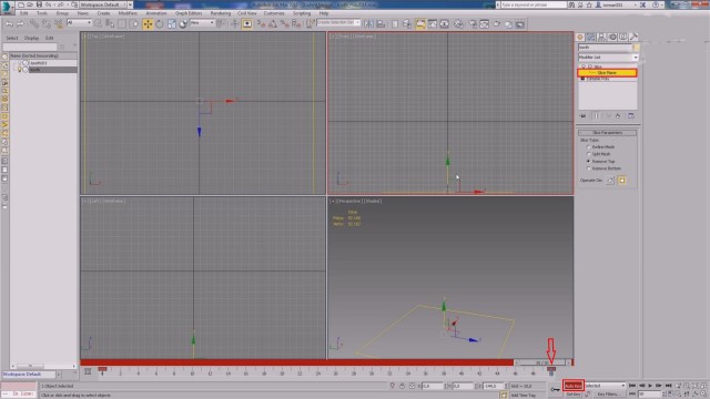 Шаг-6.Можно посмотреть, что у нас получилось на данный момент. Для этого, отключим кнопку Auto Key, а также снимем выделение с Slice Plane. Можно перейти в окно перспективы (P) и нажать кнопку Play, для воспроизведения анимации.