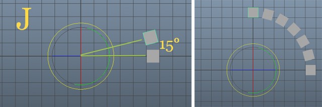 Для того чтобы вращать объект на 15° зажмите клавишу J.