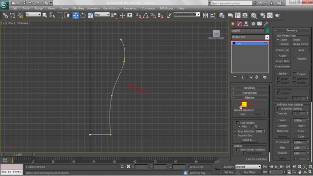 Шаг-1.Открываем программу 3DS Max, переходим в вид Front (F), заходим во вкладку Create -> Shape и выбираем линию. В настройках линии поставить галочку на Smooth и рисуем примерный силуэт нашего бокала. После этого, переходим на вкладку modify, выбираем работу с точками Vertex и при необходимости сдвигаем точки, чтобы получить максимально нужный результат.