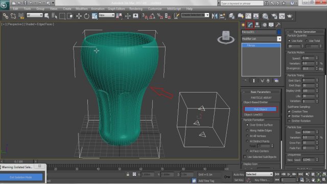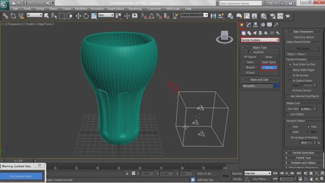 Шаг-15.Для удобства, переведем наш стакан в изолированный режим. Чтобы это сделать, можно просто выделить стакан и нажать сочетание клавиш Alt + Q. После этого, создадим объект из вкладки Create -> Geometry -> Particle Systems и нажмём на кнопку PArray. После чего, создадим данный объект в сцене, как показано ниже.