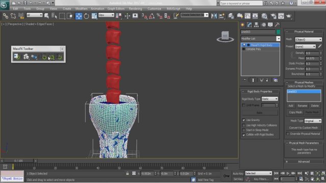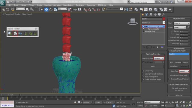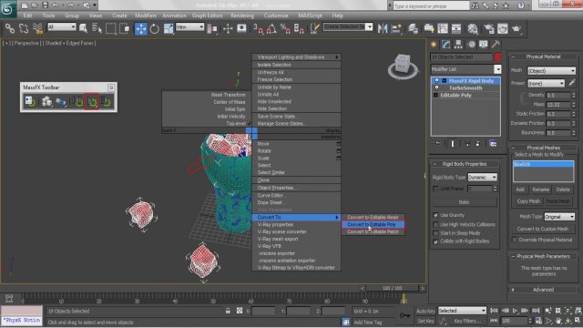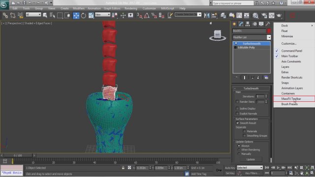 Шаг-28.Разместим объект льда посередине нашего бокала и сделаем его копию в количестве 18 штук. Копируем объекты так Instantce. Далее, выделим первый нижний кубик льда и в верхней панели инструментов кликнем ПКМ по свободному пространству, выберем из меню MassFX Toolbar. После этого, появится еще одна дополнительная панелька для работы с объектом, которая позволяет запустить анимацию падения кубиков льда в стакан.