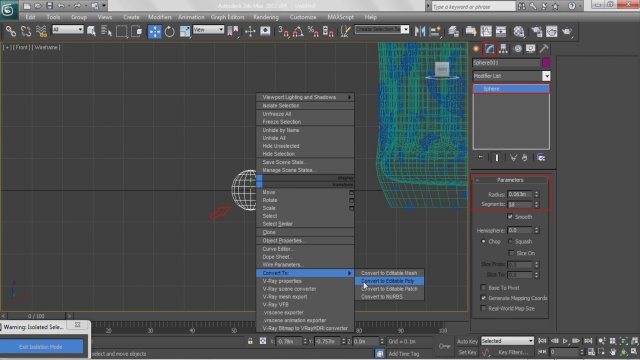 Шаг-22.Перейдем в вид Front и из вкладки стандартные примитивы создадим небольшую сферу, с указанными ниже параметрами. После этого, конвертируем сферу в Editable Poly.