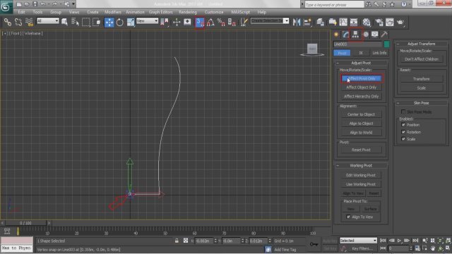 Шаг-2.Далее, нам необходимо привязать систему координат x y z, к нужной точке линии. Эту систему координат ещё часто называют Pivot. Для того, чтобы это сделать, перейдём на вкладку иерархия, включим трехмерную привязку по вершинам (Vertex), нажмём на кнопку Affect Pivot Only и перенесём Pivot в указанную ниже точку. После этот отожмём кнопку Affect Pivot Only.