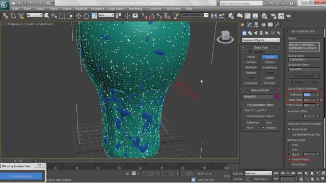 Шаг-25.Теперь, произведем некоторые настройки. Во-первых, чтобы спрятать появившуюся копию объекта, перейдем вниз по стеклу настроек, раскроем свитер дисплей и поставим там галочку Hide Distribution Object. Выше по стеку, поставим галочку Random Faces, это для того, чтобы объект капли расположился на объекте стакана рандомно. Также, выше укажем количество размноженных данных капель на стакане и его масштаб.