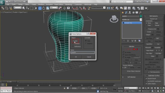Шаг-7.Выходим из режима выделения полигонов и сделаем копию нашего объекта. Для этого, кликнем по объекту правой кнопкой мыши и выберем Clone. Скопируем объект как независимую копию.