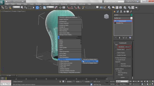 Шаг-13.Применим к объекту с именем Line003 модификатор TurboSmooth и зададим количество итераций равного 2. После этого, вновь кликнем по объекту ПКМ и вновь конвертируем объект в Editable Poly. После этого, добавим нижний полигон, который мы удалили ранее. Напомню, чтобы добавить полигон, необходимо перейти на уровень Border, выделить нужную границу и нажать на кнопку Cap.