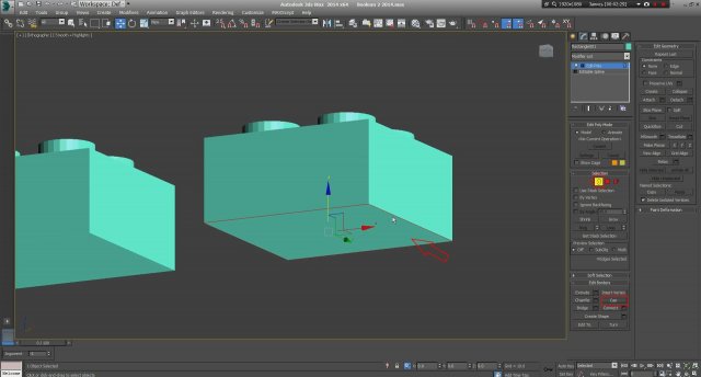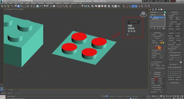 Самое главное и самое тяжелое в этом примере, поверхность с окружностями мы получили. Осталось вытянуть геометрию вниз, чтобы доделать нашу деталь Лего. Для этого, опять-таки перейдем в режим Border, выделим границы объекта и удерживая клавишу Shift вытянем полигоны вниз. После этого, не снимая выделения с границ, нажмём на клавишу Shift, чтобы закрыть нижнюю часть деталей полигоном.