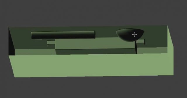 Идём далее. Допустим нам понадобилось добавить еще одно углубление рядом с нашей сферой. Пусть это будет цилиндр. Чтобы это сделать, необходимо вновь удалить верхний полигон, разместить на нужном уровне цилиндр и секущей плоскостью обрезать его в нужном месте. То есть всё тоже самое что мы делали со сферой. Сделайте это и сравните результат с рисунком, который показан ниже.