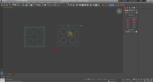 Итак, переходим на вкладку сплайнов и строй сплайн прямоугольника, внутри которого построим 4 сплайна окружности. Также, не забудем выровнять окружности в центре сплайна прямоугольника.