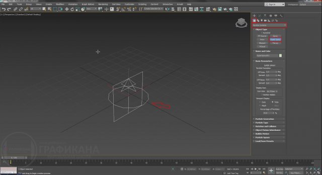 Переходим на вкладку Create, в выпадающем списке выбираем Particle System, нажимаем на кнопку Super Spray и рисуем его в окне вьюпорта.