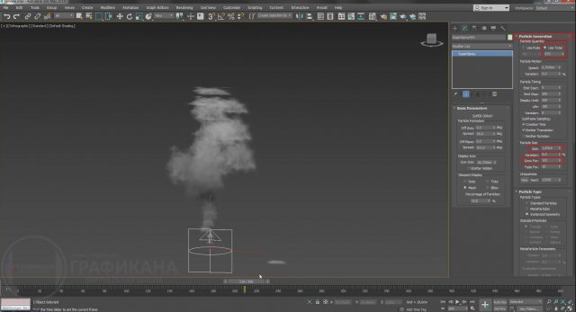Шаг-12.Далее следует определиться, что именно нас ещё не устраивает в данном дыме. Для этого прокрутите шкалу анимации и посмотрите, как ведут себя частицы. Ну во-первых, нас не устраивает то, что частицы вылетают прямым вертикальным столбом и во-вторых, нас не устраивает то, что внутри этого столба частицы очень сделаем так, чтобы частицы вылетали не прямым столбом, а разлетались в стороны. Для этого раскроем свиток Basic parameters. В нём мы видим два параметра скорости Speed. Изменив эти два значения, мы уже увидим как частицы разлетаются в разные стороны.