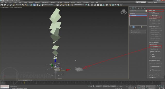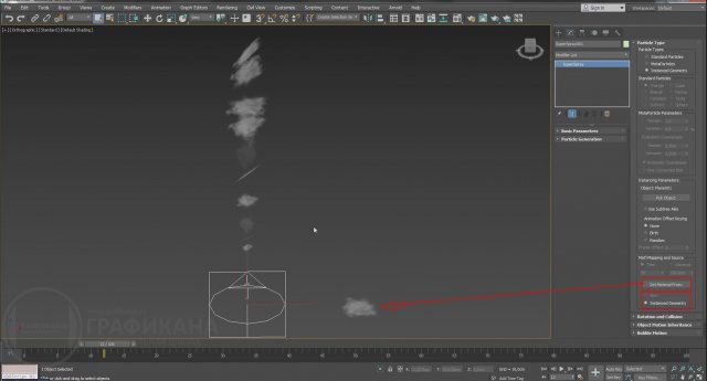 Шаг-9.Теперь давайте укажем то, что мы хотим увидеть в качестве частиц наш Plane с текстурой дыма, которая в дальнейшем будет размножено на множество элементов. Чтобы это сделать, раскроем свиток Particle Type (Тип частиц). В первом же разделе данного свитка переключимся на Instanced Geometry. После этого активируется кнопка Pick object, нажав на неё можно выбрать объект в качестве частиц. Сделаем это и посмотрим, что получится.