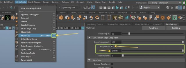 Для этого нужно зайти в настройки инструмента Multi-Cut, поставить галочку Edge Flow и выставить значение равное 0.8.