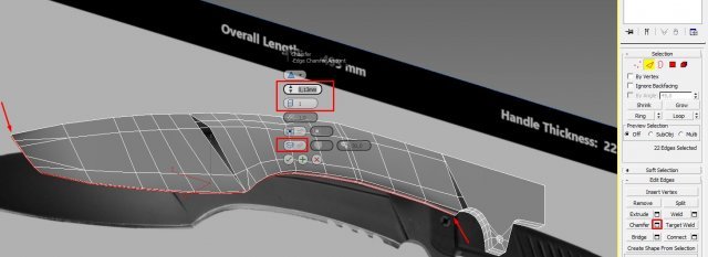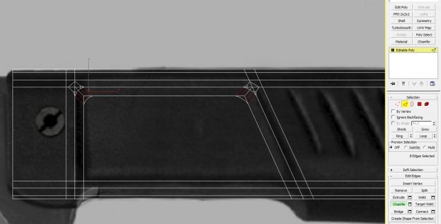 Шаг-19.Работаем дальше над нашей моделью. Необходимо поработать с указанной ниже частью. Нужно сделать Chamfer одному из рёбер, а также добавить ещё 2 дополнительный ребра и выровним их по референсу. Для удобства я сделал объект ещё более прозрачным, применив к нему созданный прозрачный материал. Также для удобства перемещения точек вдоль рёбер, можно переключиться в свитке Constraints на Edge.