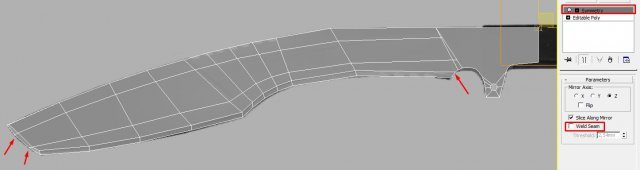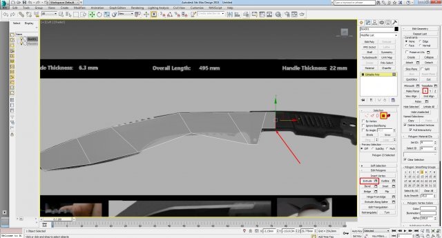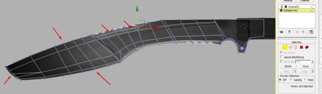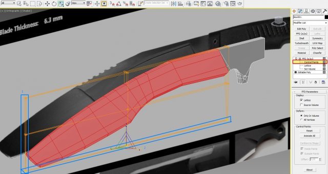 Шаг-32.Теперь можно сделать коллапс модификатора Symmetry. После переходим к модификатору Editable Poly в режим полигонов и выделяем все полигоны лезвия. Далее применяем к ним модификатор FFD 3x3x3, активируем Control Points, выделяем верхние центральные точки и сужаем их по оси Х. После чего делаем коллапс модификатору FFD 3x3x3.