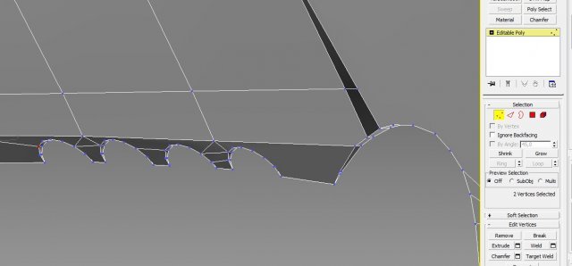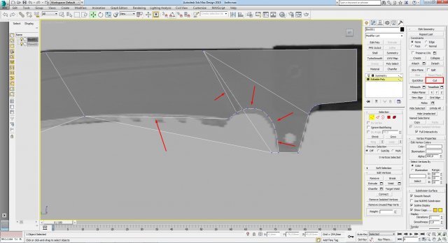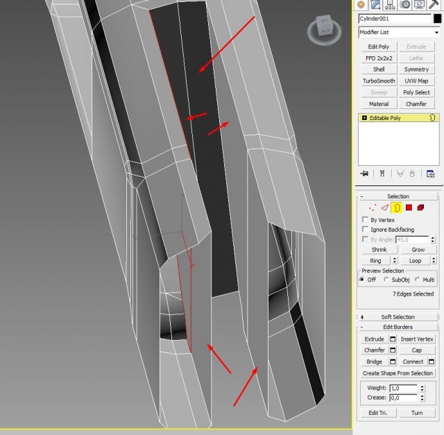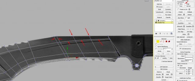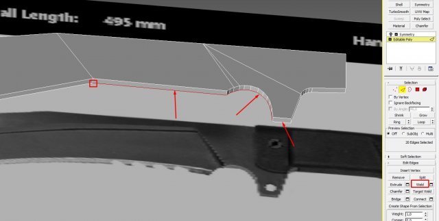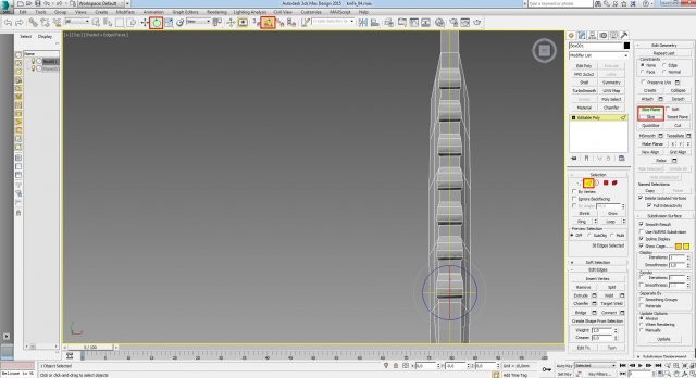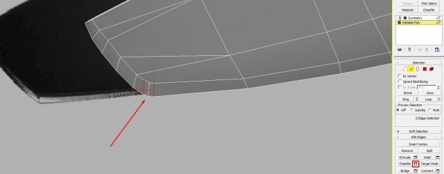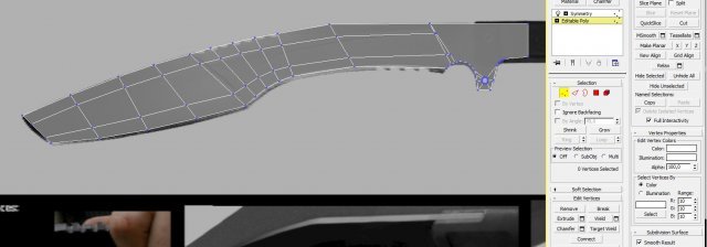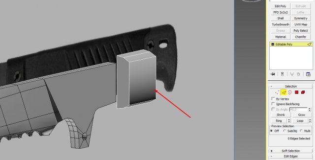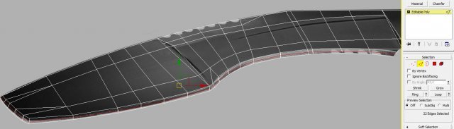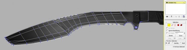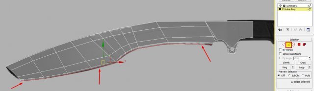 Шаг-4.Далее конвертируем объект в Editable Poly, добавляем несколько дополнительных рёбер и формируем пока что грубую форму лезвия.