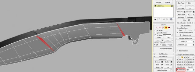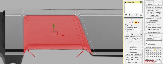 Шаг-18.Выделим следующие полигоны нашей модели и применим к им группу сглаживания Auto Smooth, предварительно очистим сглаживание на этих полигонах, нажав на кнопку Clear All.