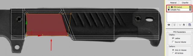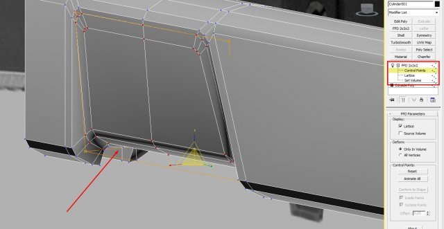 Шаг-43.Теперь с помощью того же модификатора FDD 2x2x2 сформируем впадину нашей ручке, как показано на референсе. После чего, делаем коллапс модификатора FDD 2x2x2.