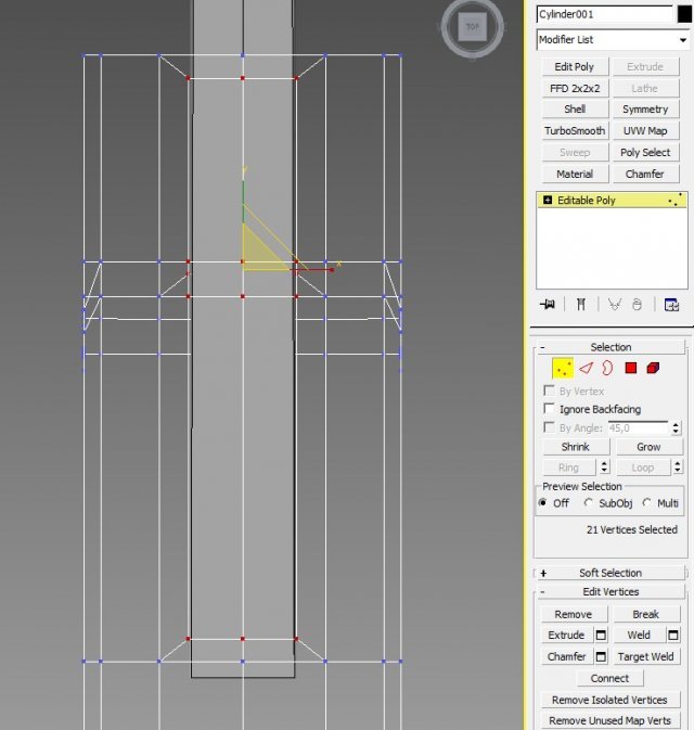 Шаг-27.Теперь сделаем вырезы в верхней части модели. Для этого, нам нужно создать вспомогательный объект - цилиндр, который необходимо преобразовать в нужную форму выреза. Также, после того, как примерная форма создана, ставим её на своё место и размножаем этот цилиндр как Copy на нужное количество. После того, как цилиндры установлены на своё место, делаем их единым объектом, с помощью кнопки Attach.