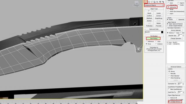 Для этого, делаем активным наш основной объект, переходим в Compound Object и выбираем ProBoolean, выставляем нужные нам настройки, активируем кнопку Start Picking и кликаем по цилиндрам.