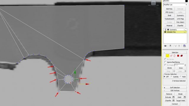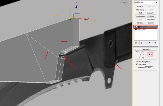 Шаг-14.Ещё более точно выравнивает геометрию и формируем геометрию в передней части. Для этого удаляем лишние полигоны, затем вытягиваем новые и также ровняем их по референсу. После этого активируем модификатор Symmetry и снимаем галочку Weld Seam. Далее делаем коллапс этого модификатора Symmetry.