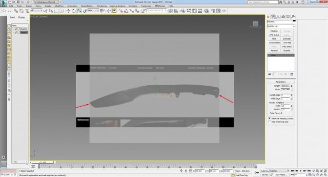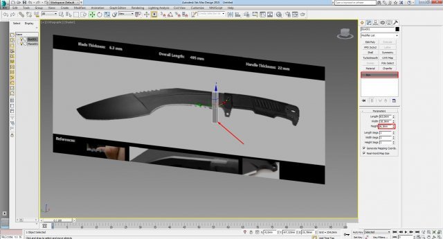 Шаг-2.После того, как референс установлен, нам необходимо выставить точные размеры кинжала, а именно его ширину. Для этого нужно создать вспомогательный объект Box с шириной 495 мм. После этого подгоним размер референса под ширину данного бокса, чтобы кинжал был того же размера. Делаем это с помощью масштабирования.