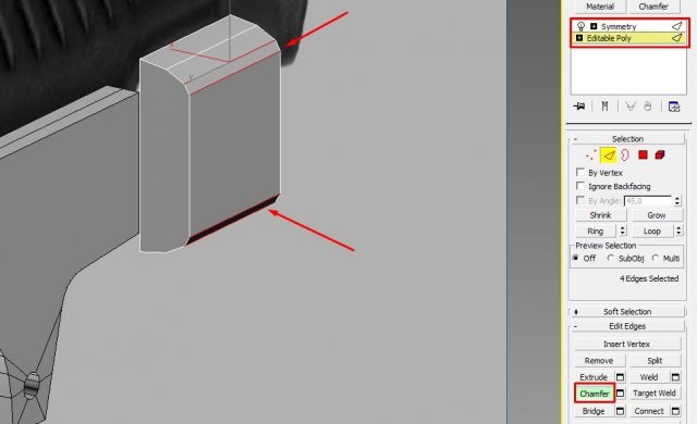 Шаг-39.Углы смягчим с помощью инструмента Chamfer, после чего сделаем симметрию данного объекта. Перед симметрией также можно удалить передний и задний полигон. После чего делаем коллапс модификатора Symmetry.