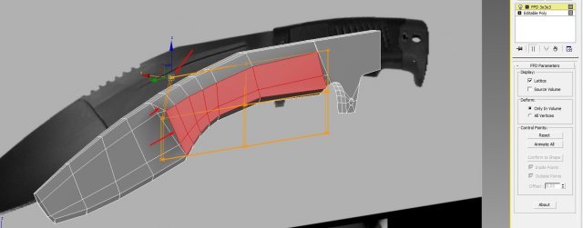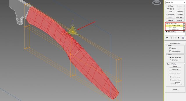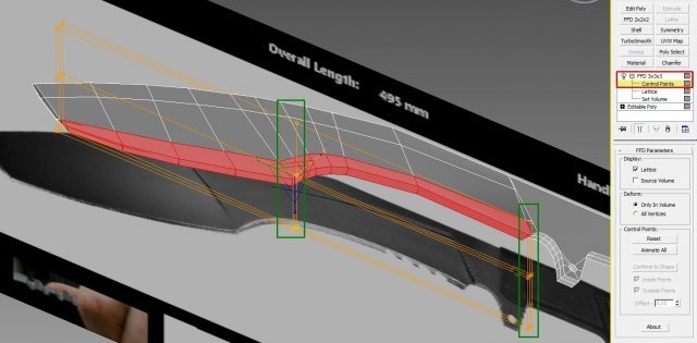 Шаг-16.Далее выделяем следующие полигоны с обеих сторон кинжала и применяем к ним вновь модификатор FFD 3x3x3, активируем Control Points, выделяем показанных ниже точки и сужаем их ещё немного по оси Х. После этого вновь делаем коллапс модификатору FFD 3x3x3.